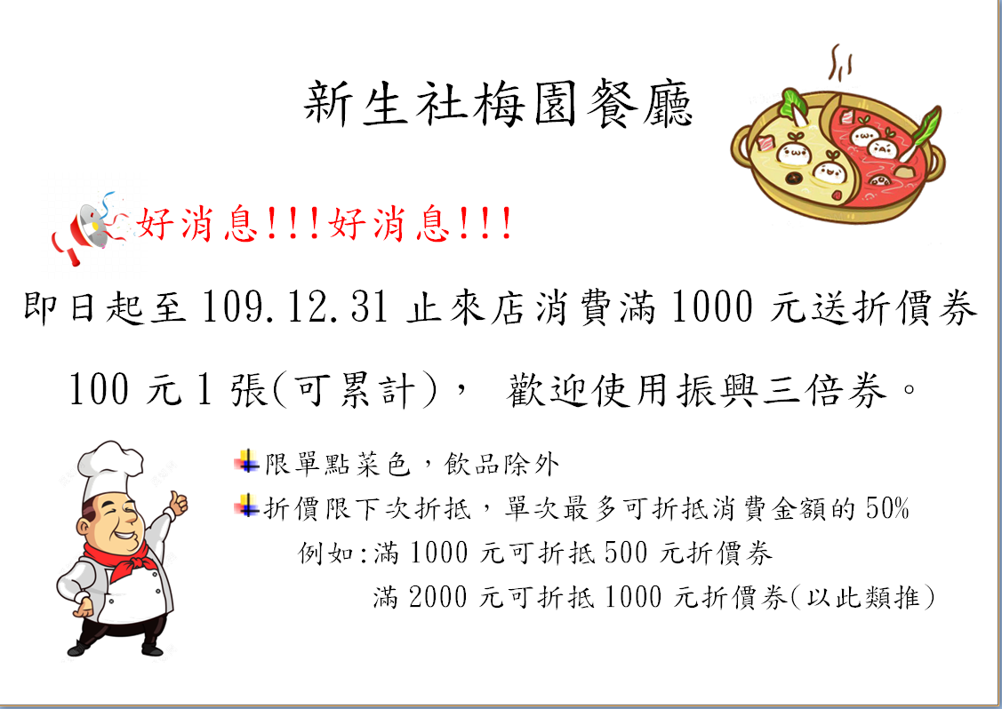 即日起至109.12.31止來店消費滿1000元送折價券 100元1張(可累計), 邀請您入內品嘗菜餚,歡迎使用振興3倍券ㄛ!