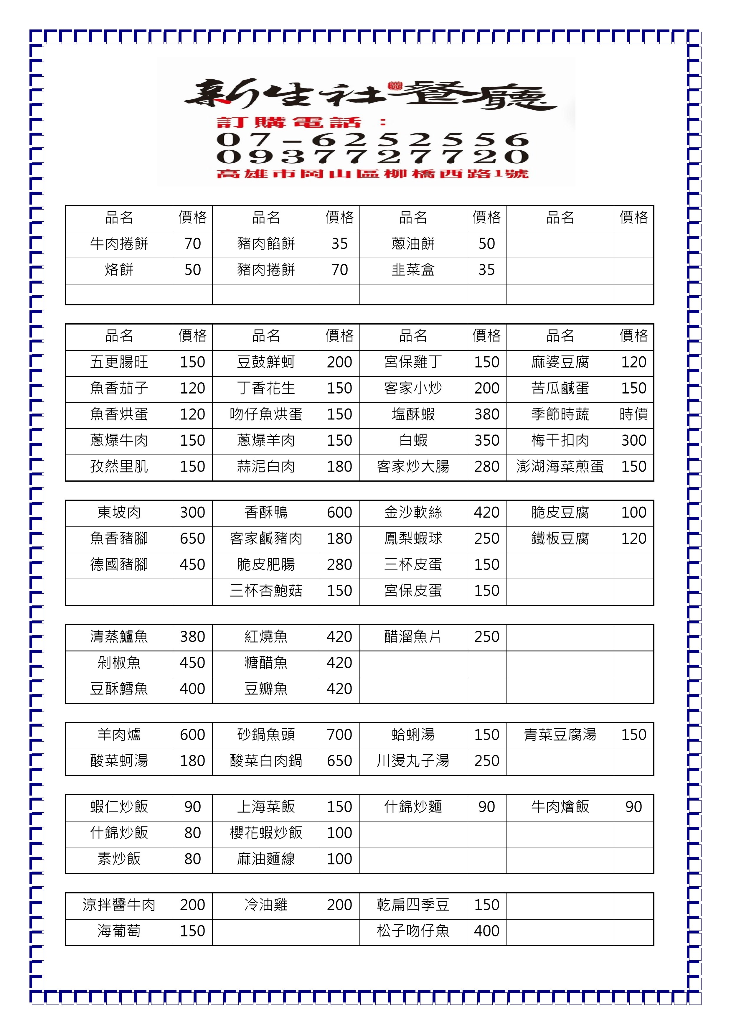 各式熱炒、餡餅、蔥油餅、東北酸白菜鍋、羊肉爐、砂鍋魚頭、香酥鴨